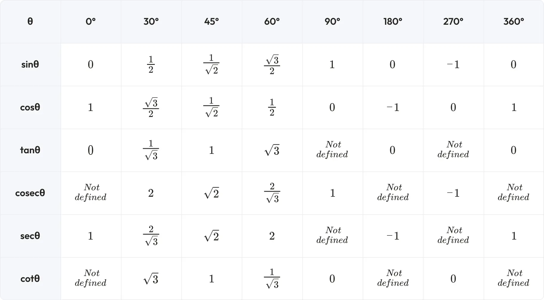 The trigonometric ratio table for six trigonometric functions is: